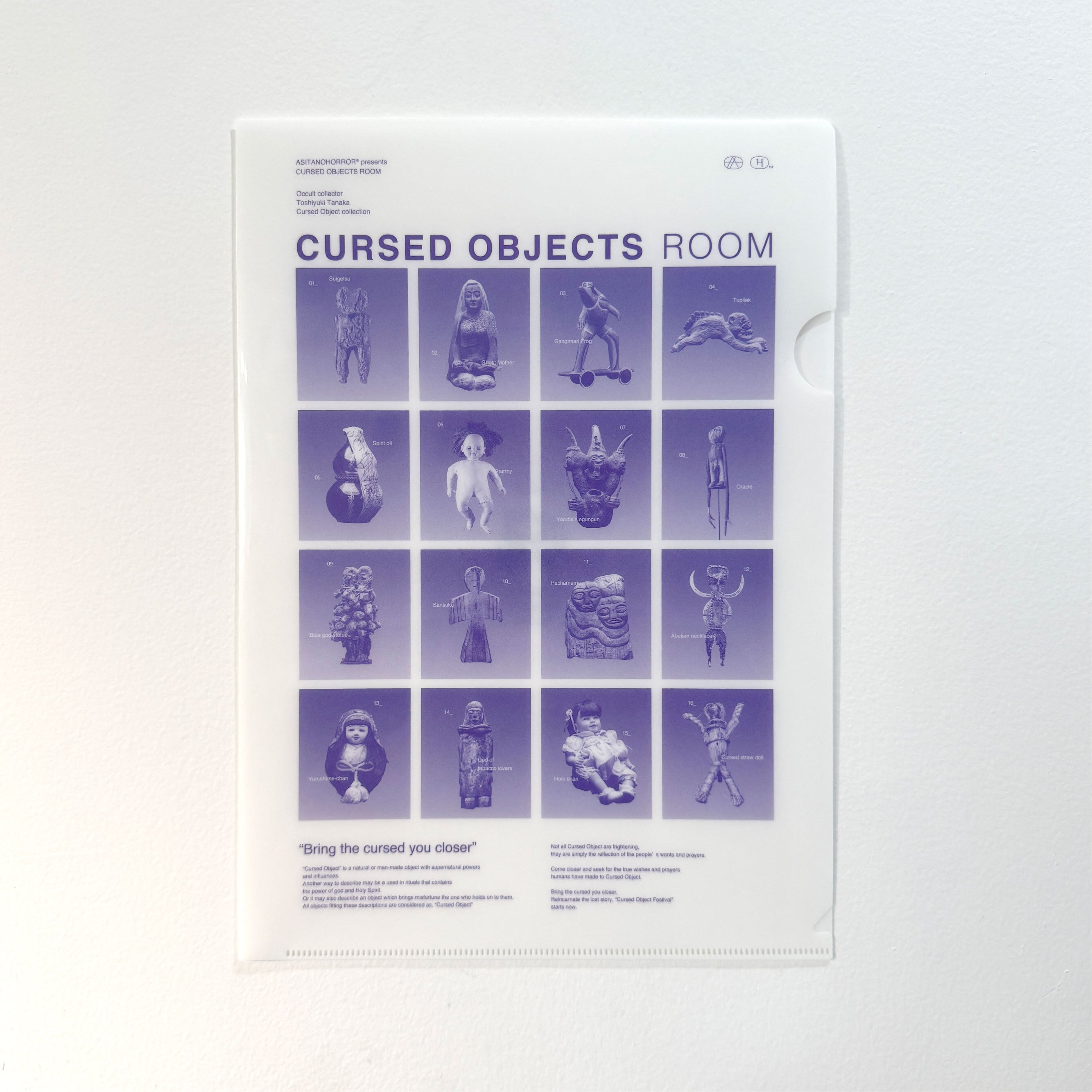 呪物たちがクリアファイルになりました。 生地はしっかりとしたクリア素材を使用しており、大切な書類やメモを呪物たちがしっかりと守ります!